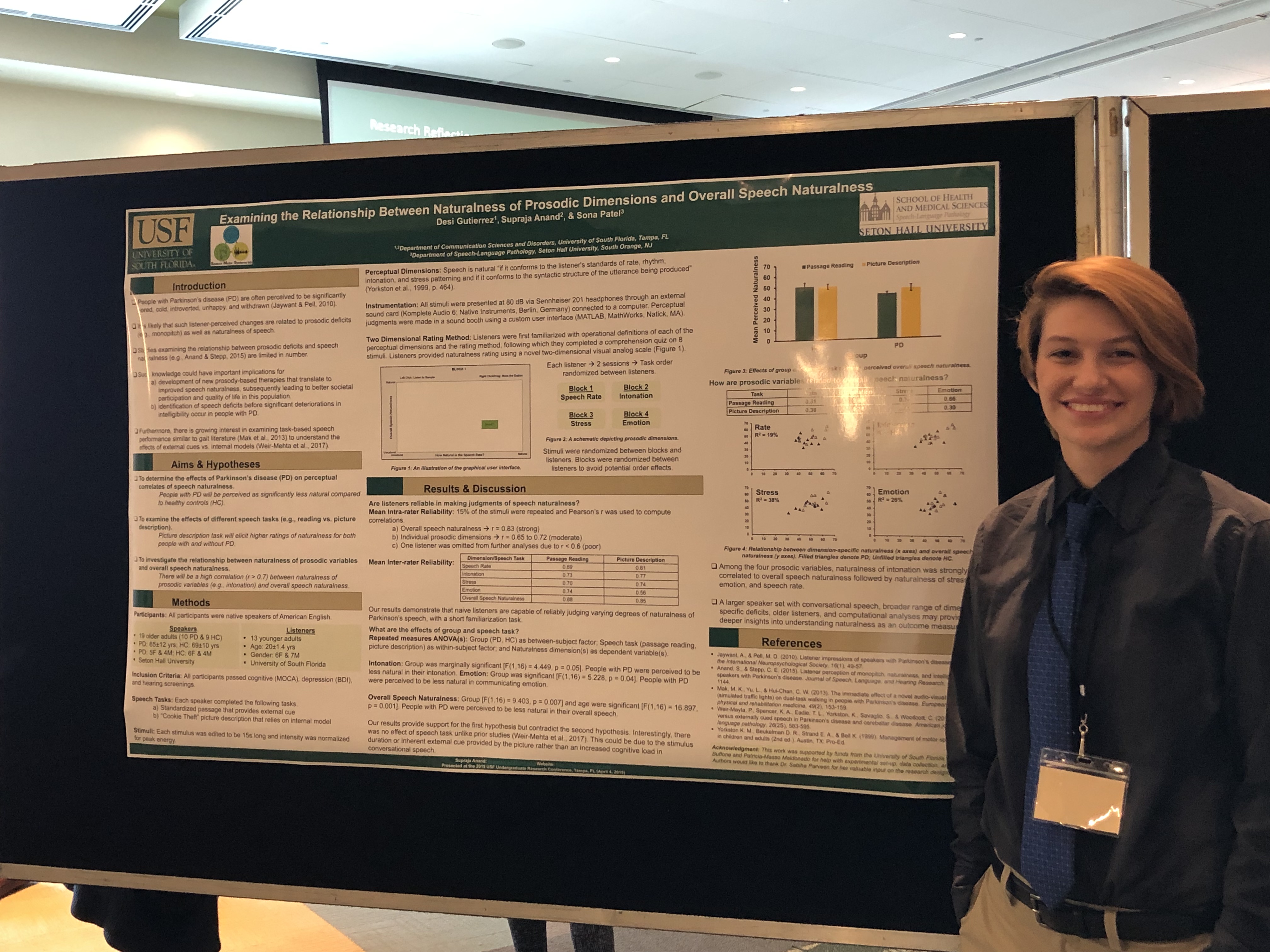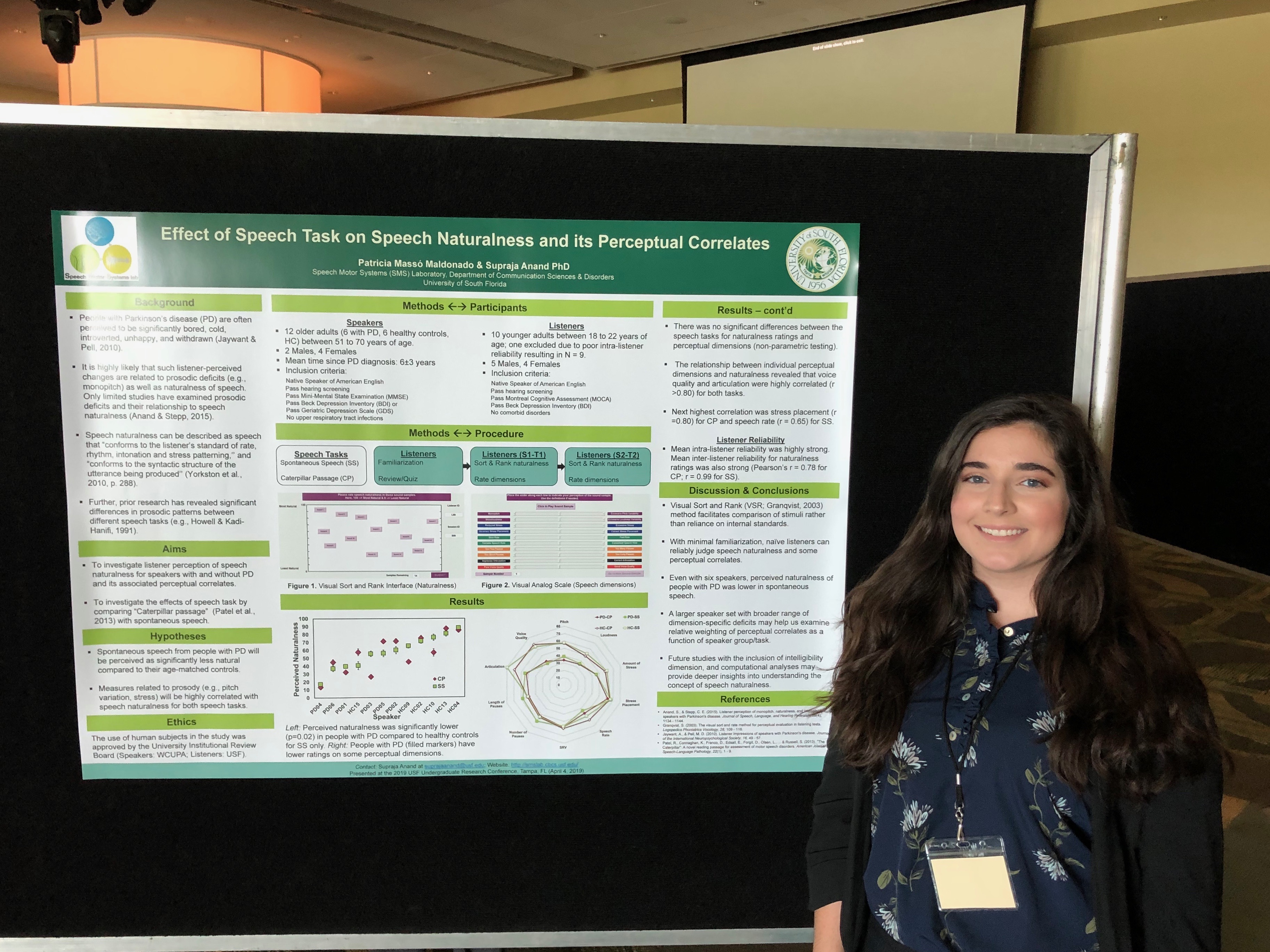 Speech Motor Systems Lab was well represented at the USF Undergraduate Research Conference. Congratulations to Patricia!! Her poster on Effects of Speech Task on Speech Naturalness and its Perceptual Correlates won an award!!